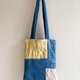パッチワーク(ピースドワーク)した布に濃いめから薄めに藍で染め分けた糸で