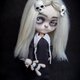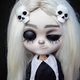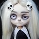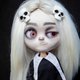 One of a kind customized Blythe doll, cartoony cute little dead girl Lenore by Yumi Camui, inspired by Roman Dirge’s comics. Her original doll is a fully jointed TBL Middie Blythe.