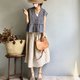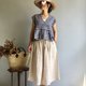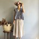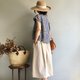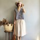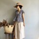 一個人旅行/藍白格子小包袖V領荷葉下擺罩衫小上衣100%亞麻