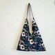 使用日本進口印花棉布,搭配牛仔布素面不同效果的三角形手提包,可雙面使用,造型時尚具有設計感!