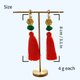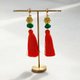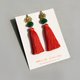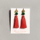 鮮やかな橙赤のタッセルに、深みのあるグリーンビーズとイエローフラワーパーツを組み合わせ、凛とした華やかさを耳元に添えました。