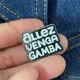 "Allez!" "Venga!" "Gamba!" Here's a pin to cheer about, because cheering for our climbing buddies is a big part of climbing. Can you see the hidden word on this pin? Hint: Turn off the lights.