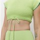 - Smocked texture with contrast stitch detail and a cropped, tie-front top