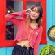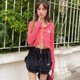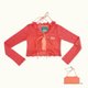 外層為長袖針織衫,蜜桃橘色,帶有品牌標誌壓印細節;內層為同色系的蜜桃橘色細肩帶繞頸上衣。