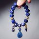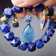 嚴選帝王青青金石(歷代帝王祭天禮石)切面寶石珠,色正而艷、白金分布細膩優美,相佐珍貴琺瑯飾(六字真言、金剛鈴、金剛杵),主飾海藍寶中產量稀有之**魔鬼藍**色調品種,寶石藍得很深邃有層次,天然海紋紋理並保有高冰透水度、閃現星光效應,是為一大器、富貴、智慧兼備之美物。