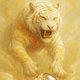 一隻虎,懷抱著一顆金色的球,氣場如山,靜而威。