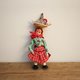手工製作,娃娃頭頂的公雞放置於竹編籃、網子及羽絨中,細節滿滿。衣著綠色印花上衣及深色紅綠格紋裙,腰上綁著紅白印花的圍裙。