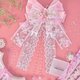 一次擁有兩種美麗!這款巨大的蝴蝶結結合了多種不同的布料和蕾絲,層次豐富,質感十足。因為部份材料透視的關係,保持了整體輕盈感。頂部的押花小畫框被櫻花和淡水珍珠包圍,可拆下作為髮夾或領口夾使用!天然粉晶垂鏈也可以靈活拆卸,讓您隨心所欲地展現不同的風采。