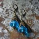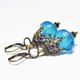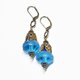 ブルー算盤型アンティークボヘミアビーズと、繊細装飾ブラスキャップ、ラピスとブルービーズを繋いだボリュームのあるピアスです。
