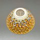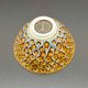 此作品是透過四到五層不同的釉藥層層堆疊,藉由每層施釉厚薄拿捏,並窯燒至1260度,歷經20小時的烈火淬煉,讓它在窯裡收縮流動,產生出孔雀羽毛的斑紋與流動感。