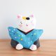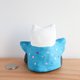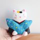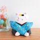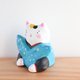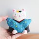 猫の福助さんの置物です。 福助さんは日本伝統の置物で幸福を招くとされている縁起人形です、  素朴で、ほっこりする表情にポップな着物の柄が個性的なアイテムです。 高さ(9センチ)程 横 (9センチ)程 重さ(128グラム) 一つ一つ色を調合して日本画用の筆で描いています。 手作りの温もりを感じられる温かい雰囲気が伝わると嬉しいです♪ 自分用、ご家族用、お友達へのギフトやお祝いのプレゼント用などにもいかがでしょうか♪ 原材料は石粉粘土です。絵の具の色が綺麗に出せて、柔らかな形を自由に作る為に石粉粘土を使用しています。 石を砕いて粉にしたものを粘土にしたものが石粉粘土です、色は紙粘土のような白い粘土ですが紙粘土より強い強度があります。 絵の具は日本画に使われる岩絵具や雲母、アクリル絵の具等を使用しています。 博多人形制作で学んだ技法を用いて作っています。 高い場所から落とした場合、 角など当たりどころが悪い場合は、少し凹む事がありますが、陶器のように割れてしまう事はほとんどありません。 防水加工を施していますので、汚れた場合等は水で濡らしたタオルやティッシュなどで拭いていただく事が可能です。 重さは陶器より軽く 紙粘土より重いです。 コロコロ転がる軽さではないので、リビングや玄関、デスクの上などいろんな場所に飾っていただく事ができます。 ○照明の具合やパソコンモニターにより、多少色合いが異なる場合があります。ご了承ください。