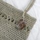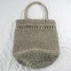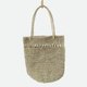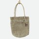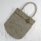 インドネシアのスラバヤ郊外の工房で作られている、ヤシの葉の繊維を手編みしたバッグ。底には円状のマチが付いています。さらに当ブランドロゴのココナッツ殻で作ったタグが付いており、その紐の部分はパイナップルの繊維で作られています。こちらは小型でスッキリした印象のバッグです。