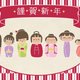 背景はリボンや矢羽柄、中央は皆練色の和紙イメージ。