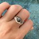 💫這款手工金屬繞線戒指,以細膩銀線環繞一顆天然銀曜石(Silver Sheen Obsidian)珠子為核心,設計成經典的「惡魔之眼」結構,周圍點綴小黑珠如睫毛般排列,捕捉石頭銀灰光澤的閃爍脈動,宛如一雙警惕的眼睛,監視並反射負面能量,讓佩戴者感受到夜空的隱秘庇護。