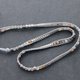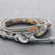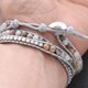 這款纏繞的串珠手鍊由灰色聚酯繩編織而成,花式碧玉石鑲嵌在黃銅上,鍍上鍍白金色。使用3步循環的金屬按鈕進行大小調整。