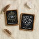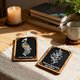 以黑卡為底、白色線描手繪,再點綴少量水晶/貝殼,像月光落在畫面裡。尺寸 7×9 cm,迷你小畫可直立擺桌或靠牆成一角小景。本商品為兩入一組,隨機出貨(可於備註寫下偏好,我們會盡量協助,但不保證)。