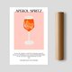 《橙光氣泡 Aperol Spritz》以柔粉橙背景與橘紅酒色構成出溫暖愉悅的調性,象徵夏日午後的閒適與義式風情。畫面中以俐落幾何線條描繪出 Aperol、氣泡酒與冰塊的晶透層次,營造出清新、典雅又富節奏感的氛圍。