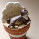 整體由手工製作的石塑粘土蓋子、擺件部分,和涂裝的陶土罐子部分組成,粘土部分已涂啞光防水油。