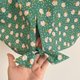 上衣採用棉質面料製成,為綠色底,點綴著帶有黃橙色莖的白色小花。