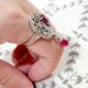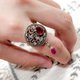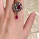 🛑 在繁複的鏤空雕花中,天然紅寶石靜靜綻放,如吊墜般懸浮於指間——整體以925純銀打造,精緻鏤空工藝呈現出典雅的復古質感,展現出剛柔並濟的設計語言。紅寶石象徵熱情、愛與力量;紅寶石色彩強烈且散發紅色螢光,寶石內微細的針狀內含物,將本身會消散的光線重覆反射至寶石內各個刻面,使紅寶石具有獨特加天鵝絨般的柔和感。