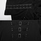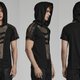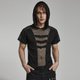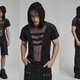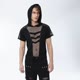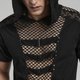 採用菱形網拼接彈力針織面料製作。帥氣連帽T恤。魅力網布鏤空。肩部拼接創意圓圈織帶,打造個性龐克。前中鏤空且有日字扣袢帶,豐富設計。