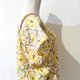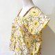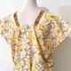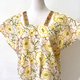 這件作品以印度傳統純手工蓋印的印花展開,柔和的奶油黃底上,綻放著以紅色線條勾勒的俏麗花朵,橄欖綠的花芯與枝條為整體增添一抹清新氣息。