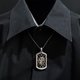 以龍麟圖騰設計的鏤空窗格吊牌式墜子,搭配灰黑色銀鈦水晶。此顆鈦晶展現優雅的銀灰色,於光源下展現明顯的銀絲閃耀。