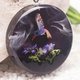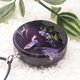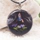 這款吊墜採用黑色角樹和帶有白色條紋的黑色透明樹脂製成。小蜂鳥棲息在真正的紫色花朵上。這種獨特的原創設計是這款作品的獨特特色。