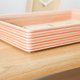 Paper-Wood是將色紙與淡黃白色的椴木材拼接的美麗木斷面為特徵的積層合板。木材斷面的線條帶有獨特的樣貌與質感,是塗裝所無法呈現的。另外,與塗裝不同,不會有掉色的情況。無論從哪裡切割開來,木材斷面是材料本身的構造,都會出現同樣的線條。這個檔案盒是混和了兩種色紙,實現出鮮豔且令人印象深刻的木材斷面。