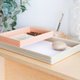 如果是要整理文件的檔案盒,依照用途有兩種不同尺寸可以選擇。A4尺寸是藍綠色,A5尺寸則是橘紅色。這個檔案盒只要有一個就非常時髦,為每日生活帶來點綴,不過如果準備同種類或不同種類的複數個,就能讓自家的書房或辦公桌的氛圍瞬間變得華麗,心情也明亮起來。