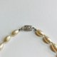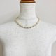 ガラス素材のバロックパールは、多くの生産工程が熟練の技術を要する手作業の為、人工的でありながらもその不規則なフォルムが個性的なデザインが特徴です。こちらのガラスバロックパールは1980年~1990年頃にかけて製造された未使用ビンテージになります。また、グラスビーズは1980年代の日本製の未使用ヒロシマビーズのストックパーツになります。当倉庫にて保管状態の良かったものをピックアップして使用しております。こちらのパールは、複数のオリジナルパール塗料にて何層にも重ね塗りを施した日本製ガラスバロックパールになっております。きめ細かい質感と程よいツヤ感の薄いシャンパンクリーム色。サイズは直径約8x12~13mmで、長さは標準的なプリンセスサイズの全長約41~42cmに。※バロックパールは一つ一つ個体差がある為、フォルム・サイズはわずかな大小がございます。クラスプには中央に1粒ラインストーンを付けた差し込みクラスプを使用。