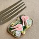 Miniature set of fish steaks on a board decorated with lemon slices and greens.