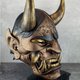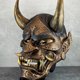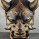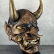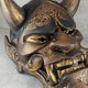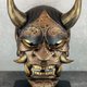 - Traditional Hannya mask in gold and black with a cracked finish, featuring smooth horns and fangs. Crafted from high-quality PLA plastic and hand-painted with acrylic paints and protective varnishes.