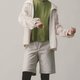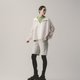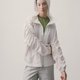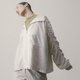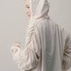 此款式納入了飛行軍裝的袖身抽皺作法,在合身版型的架構上令手臂的視覺產生新的修飾效果,輕量且舒適,包含貼身方形斜口袋的機能屬性,連帽設計的休閒感,都能讓款式更簡單地融入日常搭配中。