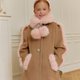 A premium double-layer wool coat in a bright strawberry-milk color, featuring a collar, sleeves, and pom-pom decorations made of lovely eco-fur, and finished with jewel buttons.