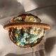 かごの中に飾られているブーケには、ピンク、ブルー、ホワイト、薄グリーンなどの淡いパステル調のクラフトバンドを使用しており、彩り豊かに仕上がっています。
