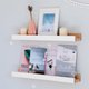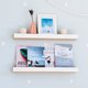 - Set of 2 Nursery Floating Bookshelves. These shelves hold a large number of books. Also perfect for placing decor, pictures, art, or toys. The shelves are deep enough to accommodate books in 2 or 3 rows. You see in the pictures the shelves are 26 inches long.