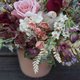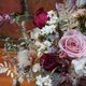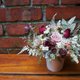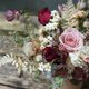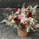 不凋玫瑰為昂然挺立的主花,進一步仔細地觀察,會發現這次搭配了許多顏色復古的迷你玫瑰,粉紅色系在自然風乾後顯得格外優雅,乾燥成擬似小花苞的型態更是點綴的最佳巧思。輔以輕盈的白色系花材、姿態自然捲曲的尤加利葉,靜謐、溫馨的祕密花園就這樣悄悄地誕生了。