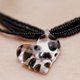 ブラックとホワイトのドットのガラスのハート モノトーンなので落ち着いたかっこいいハート 首周りは黒のボヘミアンビーズの5連ですこしボリュームがあります ハートは動かないように固定してあります 長さは首周り38㎝+5㎝アジャスター 一つ一つてづくりですので、 個々によりハートの形、ドットの配置が異なりますことご了承ください