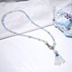 呼應藍拓帕的清亮水光,鍊身以溫潤**珍珠、螺鈿**設計為**3圈手鍊、短項鍊2用**,主墜以**珍珠**佐**藍月光石**編製流蘇,整體**藍得很雅緻**,**為夏日帶來一股沁涼,也能融入冬雪的風景**。