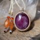 透明感がある、レッドチェリーピンクカラーのルビー その中に、白い内包物やシラーがお花のようにふわりと咲いています。 美しさと、愛らしさを兼ね備えた輝きを持つ個性的なルビーを シンプルなマクラメ編みにて仕上げました。 ◆カレンシルバー92.5ビーズパーツをあしらっています。 ◆幅広い年齢の方に末永くお使いいただけるデザインです。 ◆アジャスター部分はロウビキ糸を使用。 ◆このたびはヘンプ、ホワイト色の蝋引き糸を使用しマクラメ編み装飾を施しました。 75ct. ・紐の長さ 片側約~47cm(お好きな長さに調節可能です) ・ルビー 長さ約22.5mm 横幅最大19mm ・トップ全体 縦 約34mm 横幅23mm 厚み11.5mm 使用している天然石&パーツ ・ルビー   (モザンビーク産) ・カット入りビーピンクトルマリンビーズ ・ムーンストーンビーズ ・ミルキークォーツビーズ ・オレンジアゲートビーズ 大・小 ・オニキスビーズ  ・真鍮ビーズ ・カレンシルバー92.5 大・小 ビーズ、パーツ ・ルビー 情熱的であり、官能的な石と言われています。 ●◯●◯●◯●◯●◯●◯ *1点ものとなりますので再入荷・再制作は致しておりません。 *天然石について 地球の産物として昔からあがめられてきた天然石は多くの人々に神聖な導きを与える目的もあったと考えられていました。天然石は太古の昔からこの地球上でうまれた産物です。輝きはおとろえることはありません。 Funky garudaではひとつひとつ、手にとって厳選した特別な石達をアクセサリーに変身させ、皆さまにお届けしております。 天然石を使用しておりますので、微細な傷などがある場合がございます。これも含めて好きになっていただきたいと考えております。 *HANDMEDE について ひと編みひと編みを丁寧に心を込めて編んでいます。少しでも皆様に手にとってもらった時の感動と幸せをお手伝いできれば本望です。ひとつひとつ、個性も編み目も違います。ハンドメイドな味わいをお楽しみください。 *モニター環境や光の加減によって掲載画像と実際の商品の色味に差異が生じる場合がございます。 *商品着画等のお写真の追加はお受け兼る場合がございますのでご了承ください。 *その他の配送方法をご希望の方は、ご購入前にご相談下さい。 *天然石は天然のものですので、内包物やクラック等が見られるものがありますが、その天然石の特徴としてご理解した上でのご購入をお願いいたします。