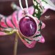 透明感がある、レッドチェリーピンクカラーのルビー その中に、白い内包物やシラーがお花のようにふわりと咲いています。 美しさと、愛らしさを兼ね備えた輝きを持つ個性的なルビーを シンプルなマクラメ編みにて仕上げました。