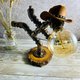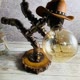 《森林牛仔鐵管燈》以粗獷工業鐵管搭配樹皮圓木底座,帶出自然與金屬的獨特對比。鎢絲大球燈泡散發柔和暖光,牛仔帽造型更增添趣味與個性。