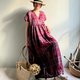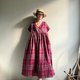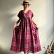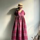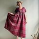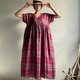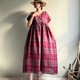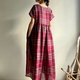 越過山丘/酒紅色系蘇格蘭格子亞麻交襟V領短袖及踝長版洋裝