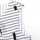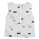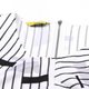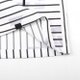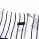 這不僅是一件條紋上衣,更是一件充滿巧思的立體藝術品。我們以富有光澤的黑白條紋緞面為畫布,於其上勾勒出鮮明的黑色幾何線條,創造出豐富的視覺層次。前胸的對襯設計打破常規,以「微不規則」的形態呈現,在秩序與隨性之間取得完美平衡,展現不經意的時尚態度。