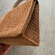 這款Bally方形兩用手袋,採用了柔軟的麂皮材質,呈現出溫潤的棕色調,表面有經典的菱格紋縫線設計,增加了視覺層次感,也展現了Bally對細節的講究和精湛的工藝。袋身上有一個金屬的「B」字標誌,簡單卻醒目,突顯了品牌的身份。