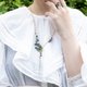 葉脈まで細かく再現されたノブドウの繊細さが魅力のラリエットネックレス。 留め具がないネックレスのため、頭から被るように着用し、虫食いの葉に通したチェーンで長さの調節が可能になっています。 ブドウの実をイメージしたビーズがチェーンの所々にあしらわれボリューム感のあるデザインに仕上げました。 ノブドウの花言葉は「慈悲」「慈愛」「人間愛」 ※チェーン端のビーズは外れない仕様になっております。 ビーズはガラス製のため、強い衝撃を加えると傷や欠ける恐れがございます。 チェーンを必要以上に引っ張るなどしてビーズに負荷をかけないよう、お取り扱いには十分ご注意ください。 ※カットガラスは色・形・大きさに個体差があります。 小さな気泡や黒い点・線などが入る場合がありますが不良ではありませんのでご了承ください。 ※擦れ等でマット加工が取れて艶が出ることがありますので取り扱いにはご注意ください。 モチーフサイズ:約38mm×約35mm チェーン:約65cm 素 材:ピューター、カットガラス、パール、ビーズ Made in Japan ※注意※ こちらの商品は日本国内の弊社職人によってひとつひとつ手作業で作られております。そのため、ひとつひとつの塗や表情が微妙に異なる繊細な作りとなっております。 また、着用後の返品は承りかねますので、ご了承ください。