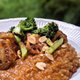 **烤紅椒堅果醬燉飯|醬燒根菜**