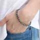 這是用深棕色彩色蠟線製成的手工編織手鍊與深藍色的捷克玻璃珠和黃銅珠一起編織。 關閉使用黃銅鐘