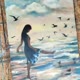 這幅畫就像一首海邊小夜曲。 在對比的光線下,黃昏時分,一個女孩被鳥兒包圍著。 這是我在亞麻布上創作的印象派油畫。
